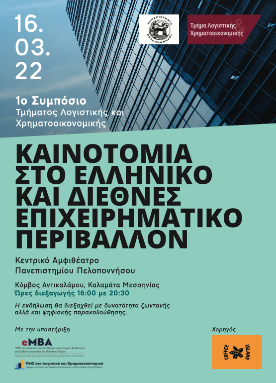 Το Τμήμα Λογιστικής και Χρηματοοικονομικής, της Σχολής Διοίκησης του Πανεπιστημίου Πελοποννήσου και τα ΠΜΣ “Μεταπτυχιακό Πρόγραμμα Ειδίκευσης στη Λογιστική και Χρηματοοικονομική” και “Μεταπτυχιακό Πρόγραμμα Ειδίκευσης στη Διοίκηση και στο Χρηματοοικονομικό Σχεδιασμό για Στελέχη Δημοσίου και Ιδιωτικού Τομέα” σας προσκαλούν στο 1ο συμπόσιο του Τμήματος Λογιστικής και Χρηματοοικονομικής με τίτλο “Καινοτομία στο Ελληνικό και Διεθνές Επιχειρηματικό Περιβάλλον”, το οποίο θα διεξαχθεί την Τετάρτη 16 Μαρτίου 2022 και ώρα 16:00 – 20:30 στο Κεντρικό Αμφιθέατρο των εγκαταστάσεων του Πανεπιστημίου Πελοποννήσου στον Κόμβο Αντικαλάμου, Καλαμάτα. Το αναλυτικό πρόγραμμα θα κοινοποιηθεί με νεότερη ανακοίνωση.”
